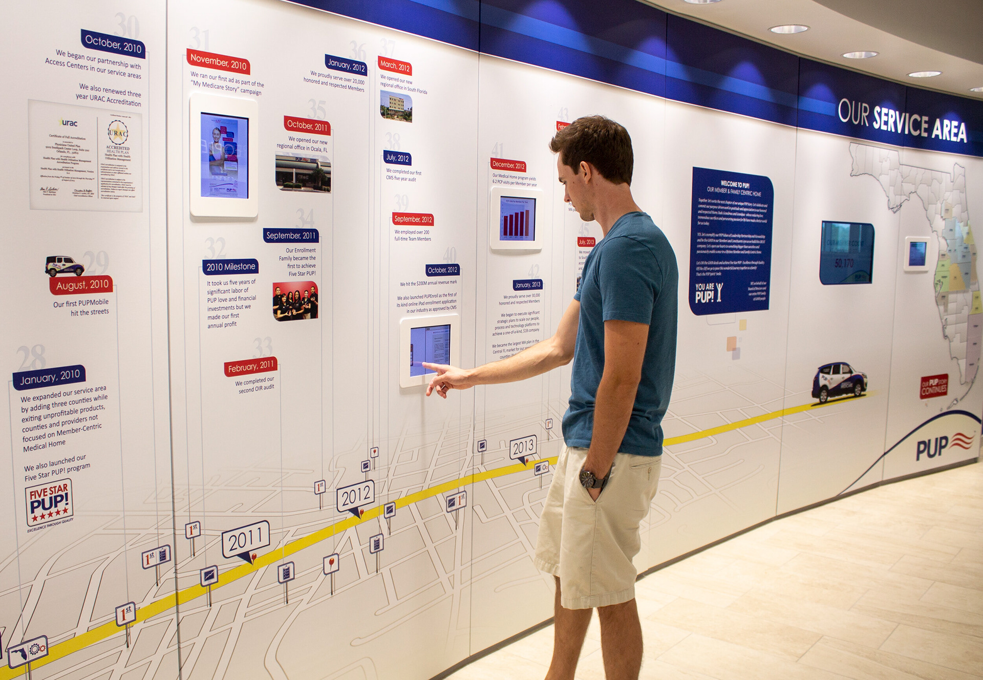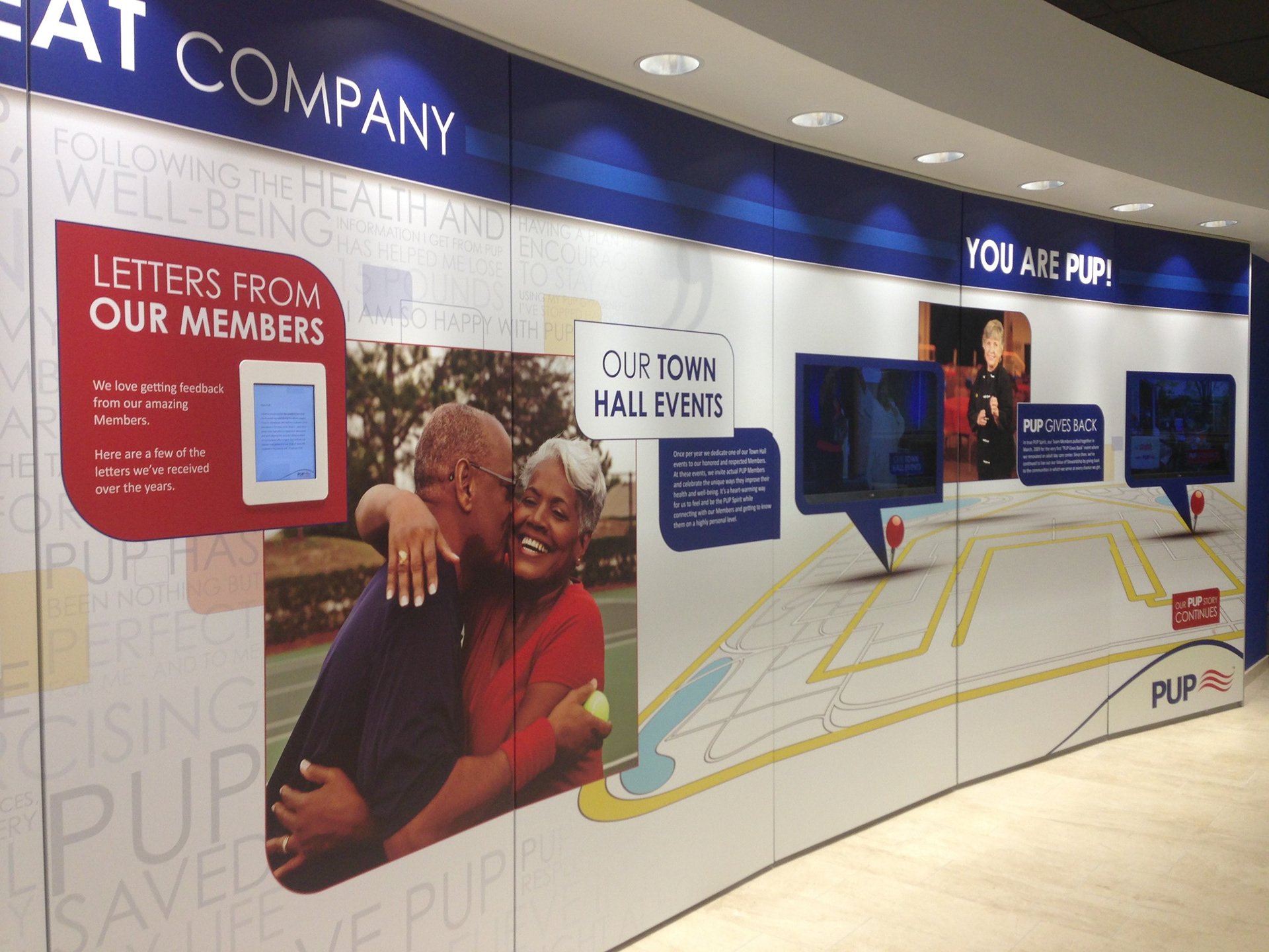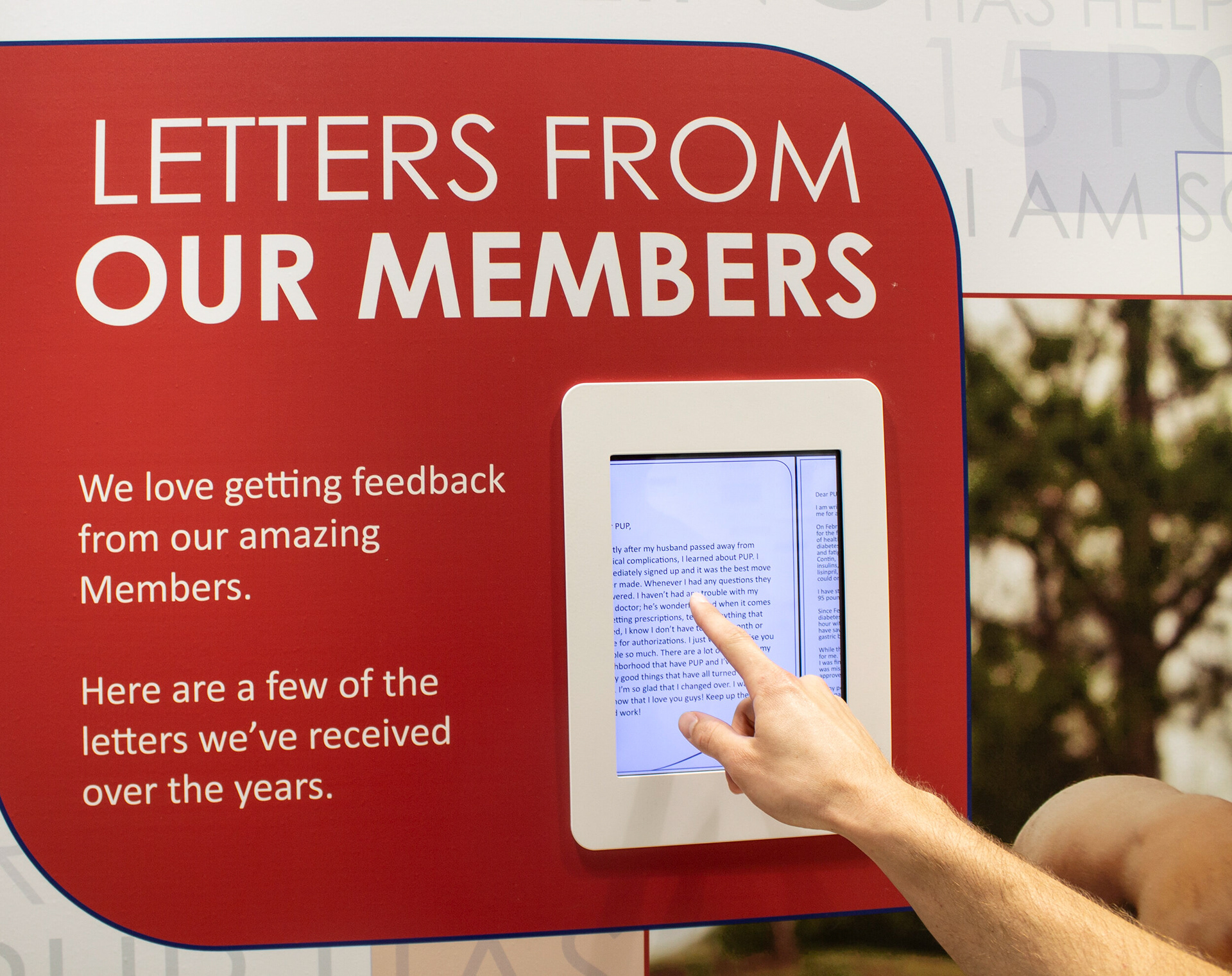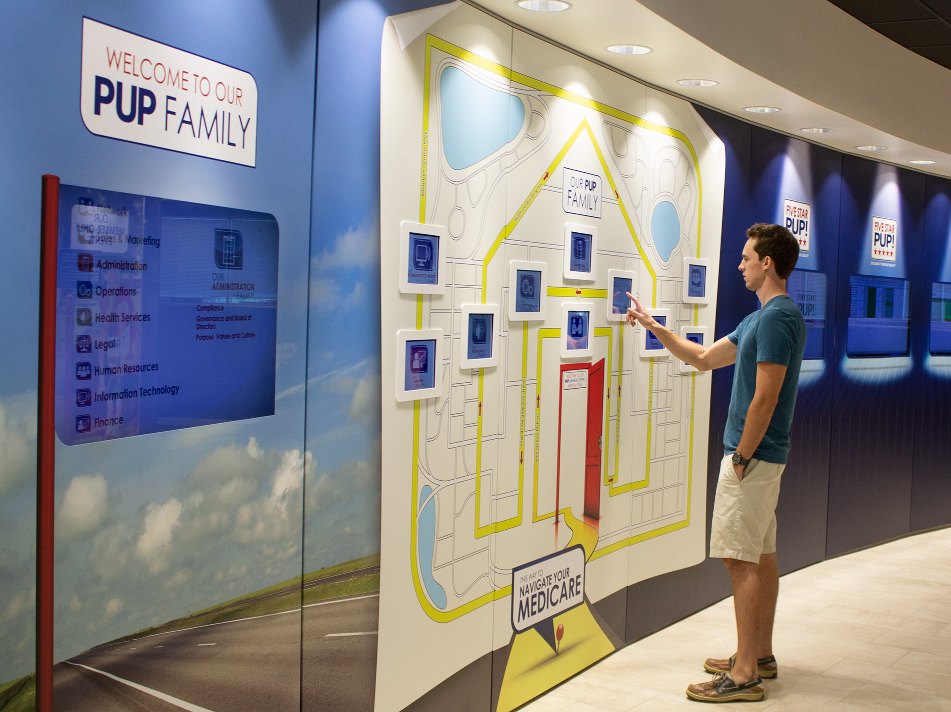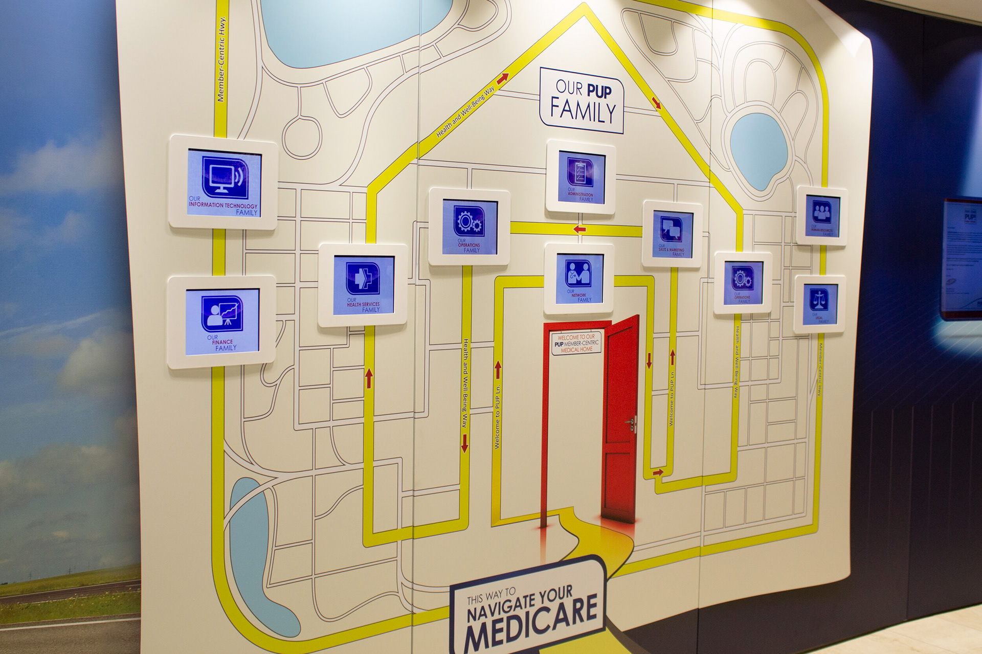 While at PUP (Physician’s United Plan), we had long, narrow hallways that visitors would be guided through, called “Tour Stops”. I would create interactive PDFs as well as video content using Adobe InDesign, Premiere, and AfterEffects to make all content live & interactive on the screens using Kiosk Pro Plus and Digital Signage.